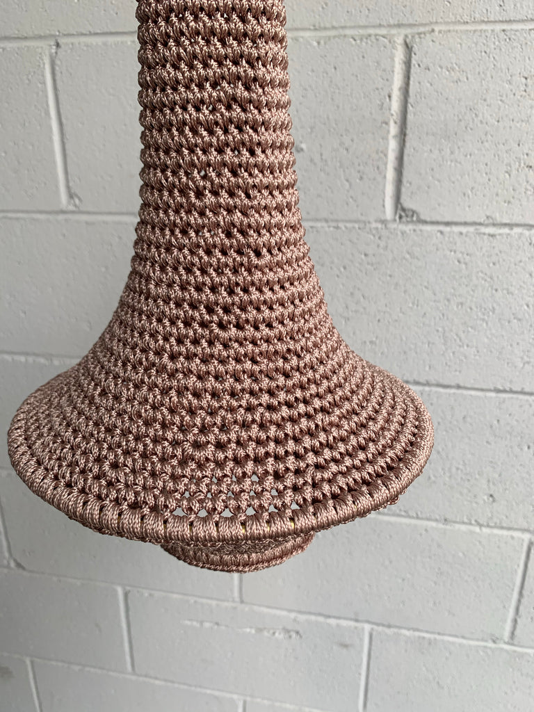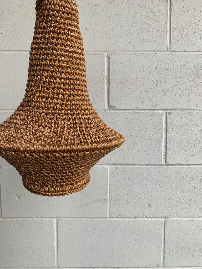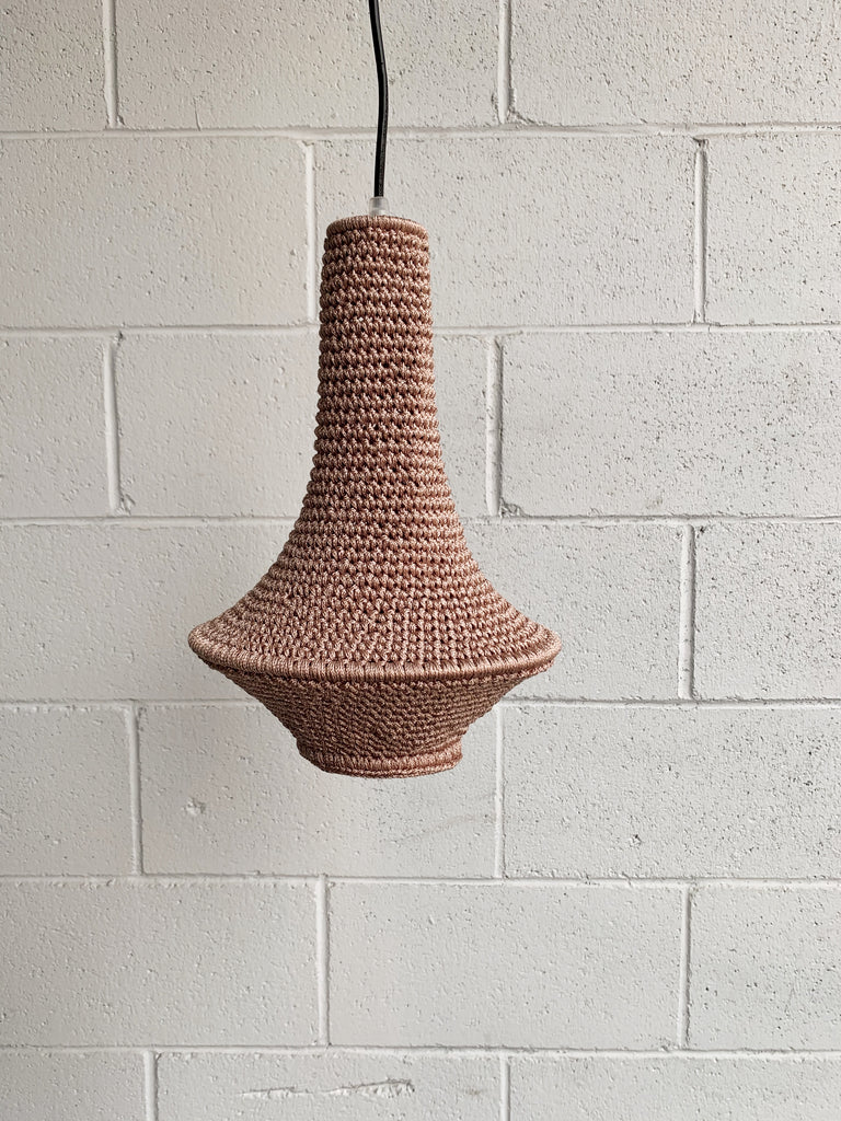 A large handcrafted statement pendant with an original personality. Ideal in bedrooms, social spaces or hung a little low over a dining table. Works well as a single feature or in a cluster of like or different sized Malika crochet pendants.