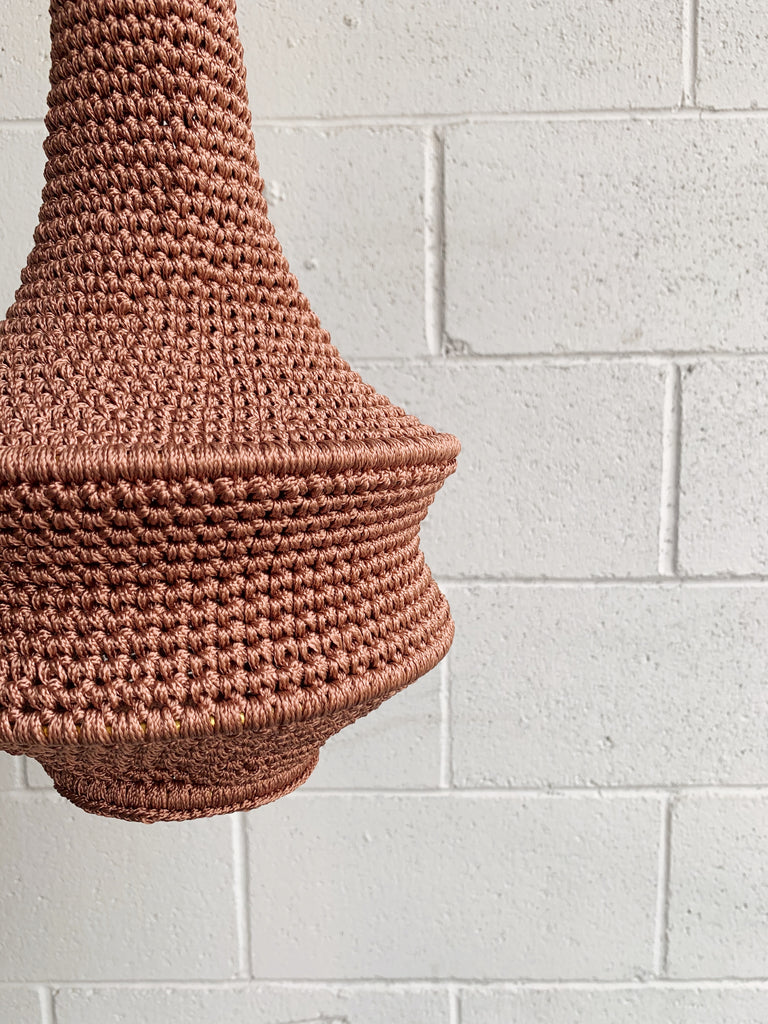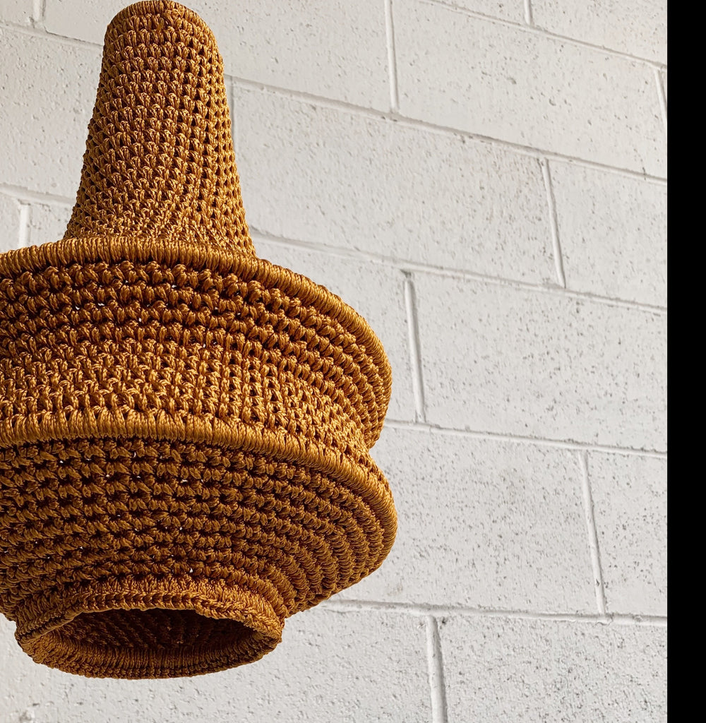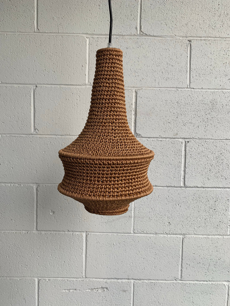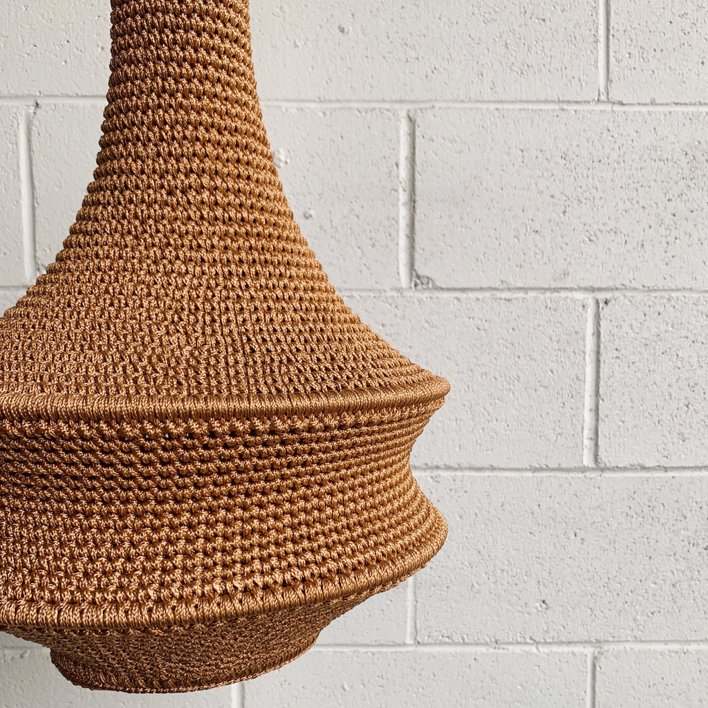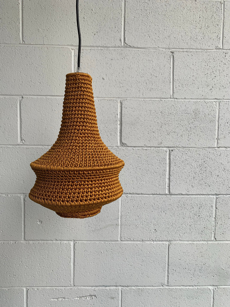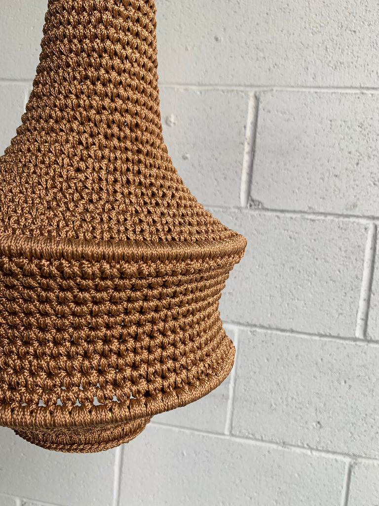 A large handcrafted statement pendant with an original personality. Ideal in bedrooms, social spaces or hung a little low over a dining table. Works well as a single feature or in a cluster of like or different sized Malika crochet pendants.
